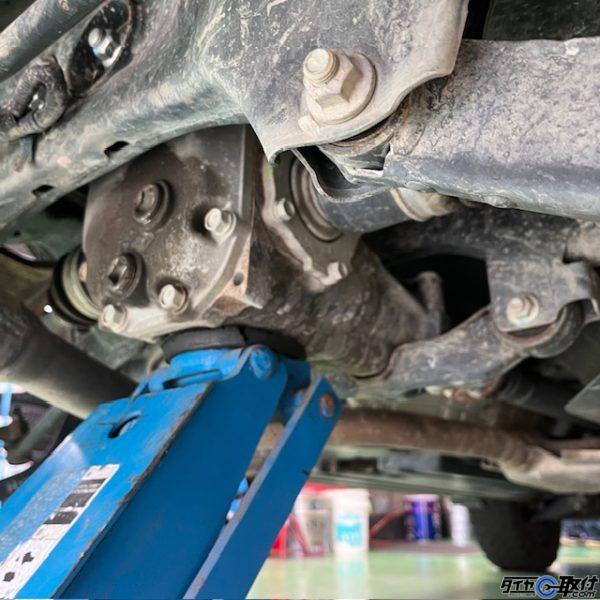 SUBARU車のデフカバーはアルミ製なので、デフケースの所のにジャッキアを当てて上げないと