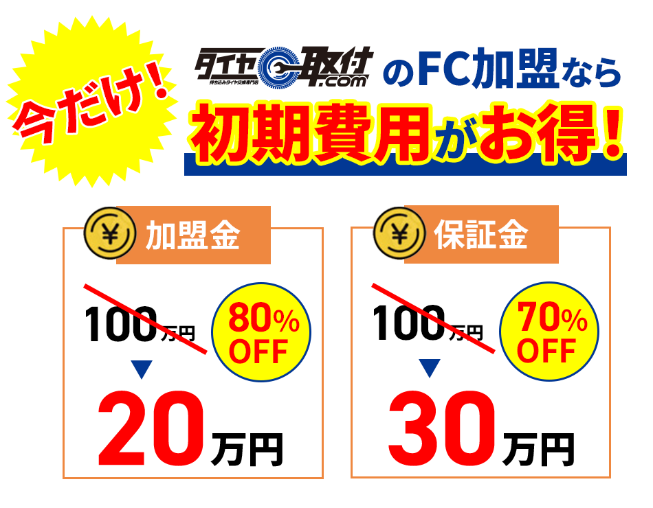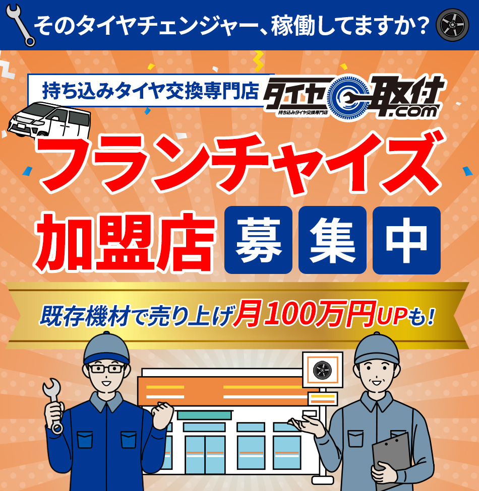 タイヤ交換機材をお持ちの企業様は既存の設備をそのまま利用可能。 ロイヤリティは毎月60000円の固定ロイヤリティのため売り上げが上がった分はすべて加盟店様の利益になります。 持ち込みタイヤ交換専門店は売り上げの90%以上が粗利のため安定した事業継続が可能。