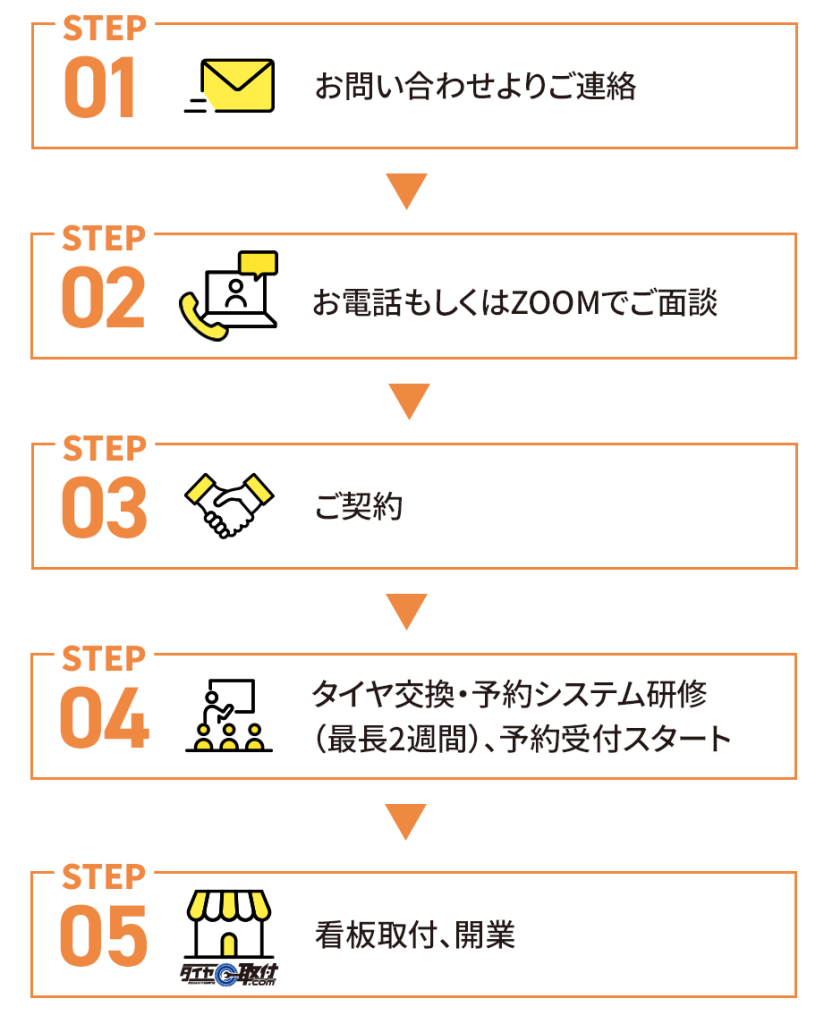 集客はすべて本部が行いますので、面倒な広告業務などはありません。 予約システム、顧客管理システムは本部がタイヤ交換専用に開発したものを提供いたします。 加盟店様は簡単な予約処理を行えばOK。お客様のタイヤ交換に集中することができます。