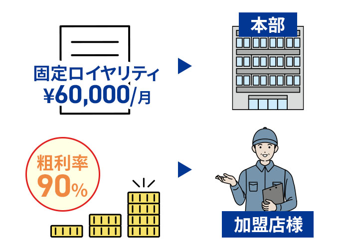 固定ロイヤリティ60000円のみ毎月お支払いいただきます。固定のため売り上げ額上昇による高騰もございません。