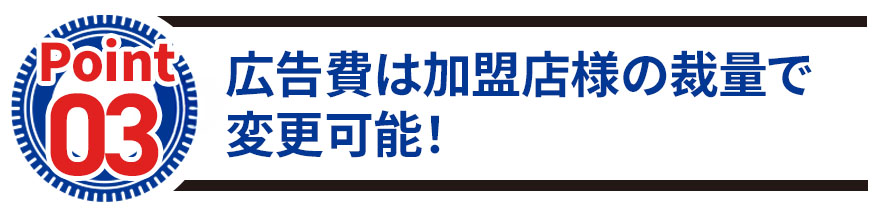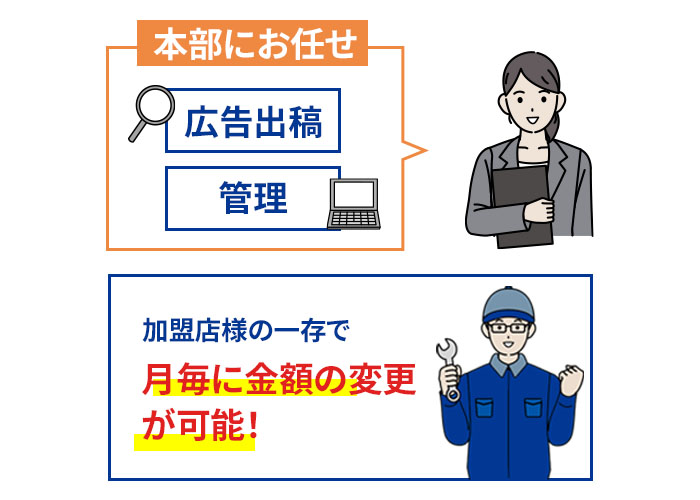 リスティング広告などの WEB広告は加盟店様の一存で月毎に金額の変更が可能。 広告出稿や管理などは弊社がすべて行いますので面倒な管理も不要です!