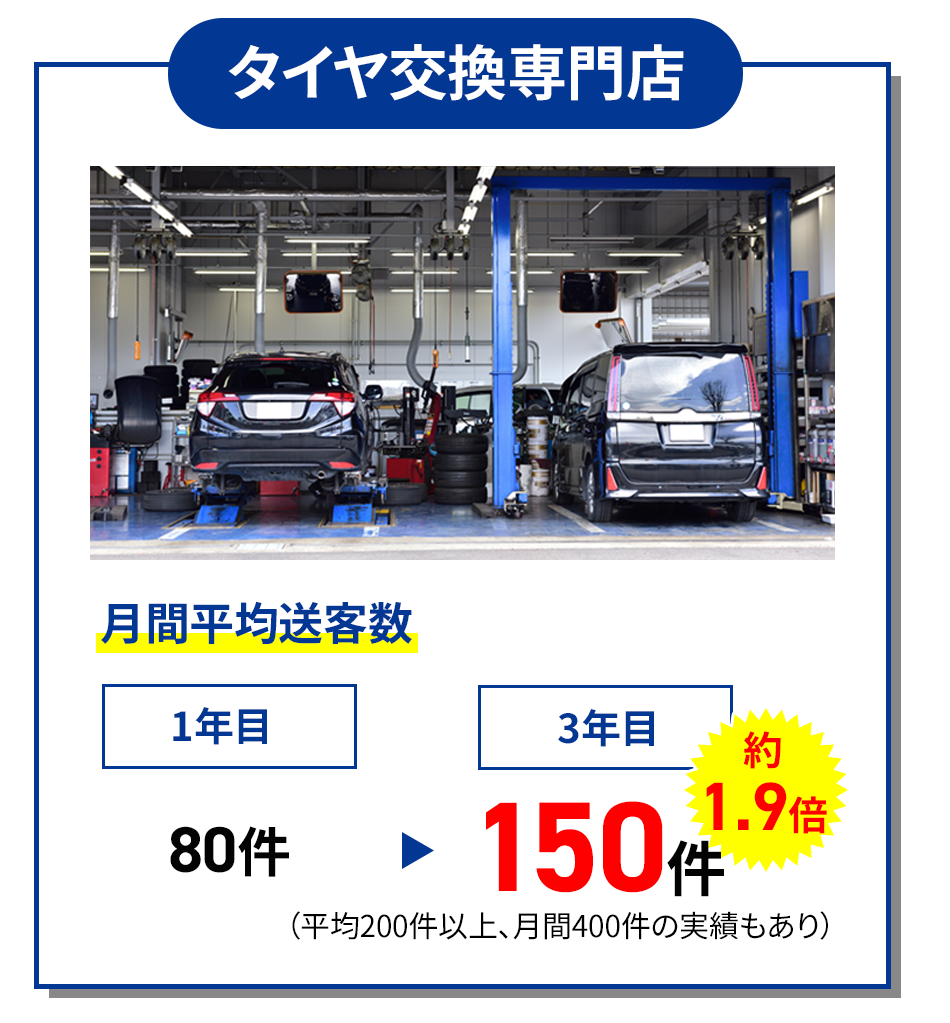 「タイヤ取付.com」のフランチャイズでは、月平均150件以上の送客実績があり、 安定した集客基盤をご提供 しています。 予約管理はタイヤ交換専用のシステムを導入しているため、 初心者の方でもスムーズな運営が可能 です。
